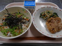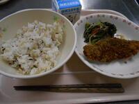 ・牛乳 ・じゃことわかめご飯 ・鮭の磯フライ ・小松菜のごまあえ ●726kcal・タンパク質32.6g |